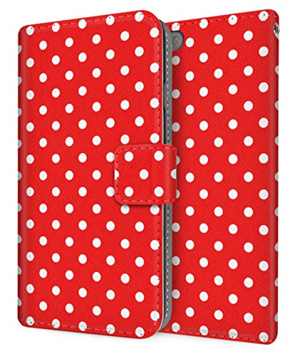 docomo らくらくスマートフォン (F-52B) 用の手帳型ケース。CaseMarket制作、ドットパターンのベビーレッド色で、ノスタルジー漂うデザイン。薄型軽量でストラップホール付き。