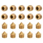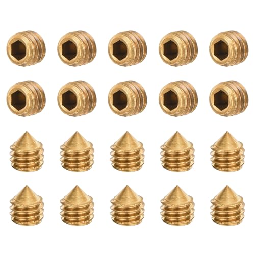 uxcellの止めねじセットは、M4x4mmサイズの真鍮製で、円錐点とインナーヘックスデザイン。家庭修理や機械用金具に最適。20個入りで金色仕上げ。