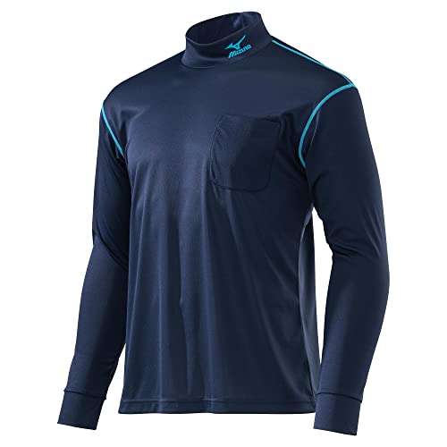 ミズノのハイネック長袖シャツ、ナビドライワークシャツ(Lサイズ、82ドレスネイビー×サックス)。ユニセックスデザインで、動きやすく、吸汗速乾性に優れた素材を使用。