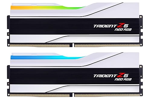 G.SKILL Trident Z5 Neo RGBシリーズのDDR5 RAM。64GB (2x32GB)、6000MT/s、CL30-36-36-96、1.40V。マットホワイト仕様で、AMD Expo対応のデスクトップ用U-DIMMメモリ。