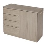 LOWYAの収納棚は、幅120㎝のオーク製キャビネットで、おしゃれなデザインが特徴です。引き出しと開き戸を備え、収納力も抜群。整理整頓に最適なアイテムです。