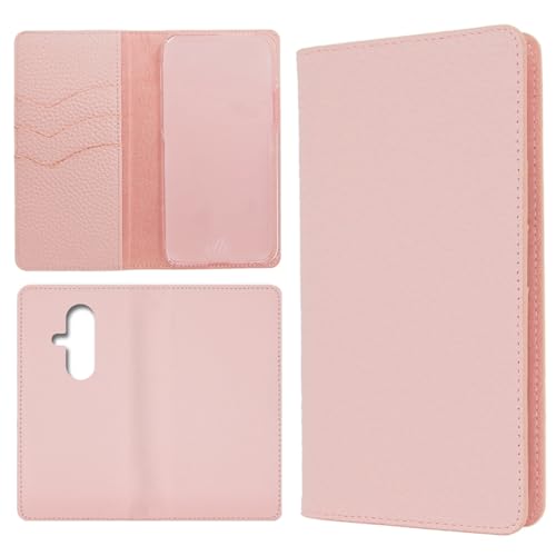 らくらくスマートフォン F-53E 用の手帳型ケース。シンプルなデザインで、本革と本スエード製。磁気カード対応、カメラ穴搭載。カラーはベビーピンク。