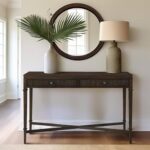 HXUHUWS 溝付き2段引き出し収納コンソールテーブルは、クラシックなダークブラウンの木製ベニヤで、アンティーク真鍮金具が特徴。モダンなホームデコレーションに最適です。