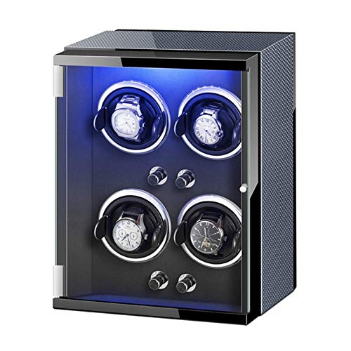 カラフルなライト付き自動ウォッチ用のカーボンファイバーレザー外装の時計ワインダー。柔軟なデザインで大切な時計を優しくケアします。