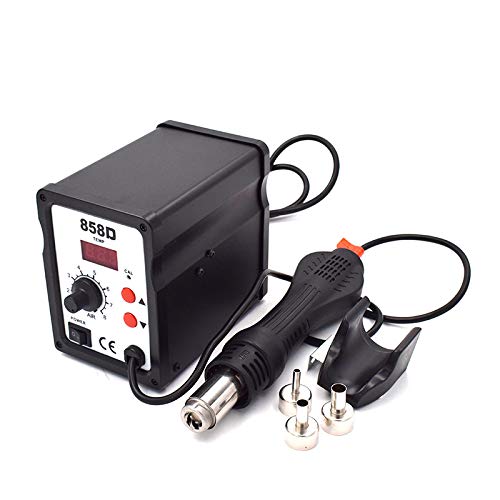 858D 800Wホットエアーガンは、調整可能な温度と風量を特徴とし、熱収縮やリワークに最適。LED画面付きで、3つのノズルが付属しています。