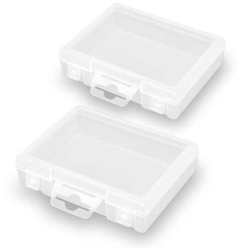 半透明のポリプロピレン製長方形容器2個セット。ヒンジカバー付きで、ビーズや硬貨、安全ピン、学習用品、ねじ、電池などの収納に最適です。