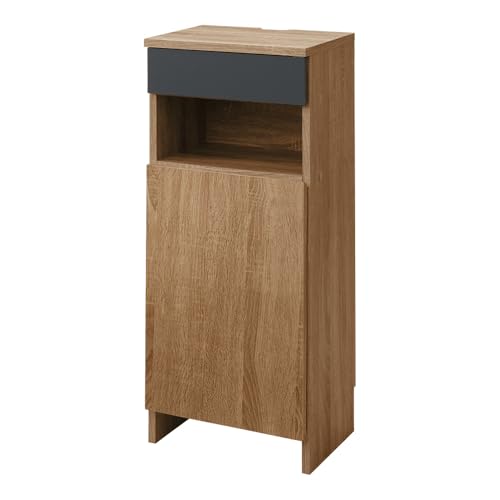 リコメン堂のルーター収納ボックスは幅38cmの木製キャビネットで、電話台やWi-Fiラックとしても利用可能。プリンターやFAXを収納でき、ミディアムブラウン×ブラックのデザインがリビングにマッチします。