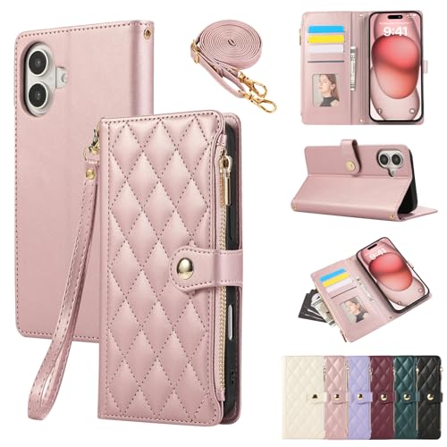 iPhone 16用の手帳型ケース。ひし形柄デザインで、ショルダー付き、カード収納やジップ付き財布機能も完備。横置き可能でシンプルかつお洒落なローズピンク色。