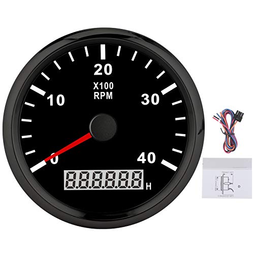 12V/24V対応の防水タコメーター。IP67規格で、ディーゼルおよびガソリンエンジンに対応。黒のフレームが特徴。