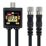 F-Factoryのアンテナ分配器は、4K/8K対応で3224MHzまでの周波数をサポート。BS、CS、地デジ、CATVに対応し、全端子電流通過型。50cmの4Cケーブル一体型で、2分配可能。ニッケルメッキ仕上げのブラックデザイン。