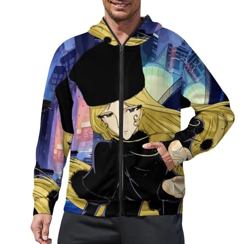 銀河鉄道999をモチーフにした、メンズジップアップパーカー。ゆったりしたデザインで、部屋着にも最適。色落ちしない素材で秋冬にぴったりなフード付き。男女兼用、大きいサイズLもあり。