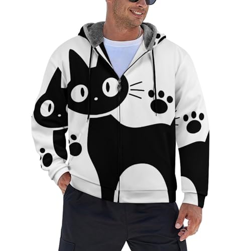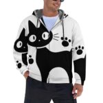 黒猫アニメ柄の裏起毛メンズパーカー。冬にぴったりの柔らかく快適な素材で、防寒性も抜群。ゆったりサイズで男女兼用、2XLまで対応。可愛いデザインが魅力のトレーナーです。