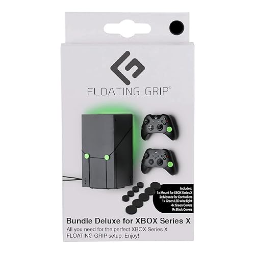 Floating GRIP Xbox Series X ウォールマウントは、コンソールを吊り下げるためのマウントキットで、LEDライトストリップとカバー付き。デラックスモデルはXbox Series Xおよび2つのコントローラーに対応。