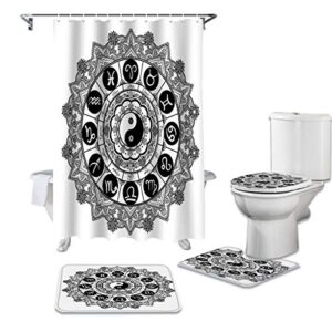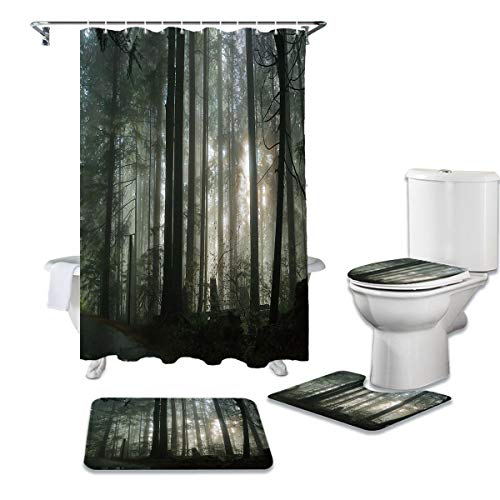 カラーフォレストロードサンシャイン防水シャワーカーテンセット。バスルーム用カーペット、便座シートカバー、フロアマット付きで、スタイリッシュで機能的なデザイン。