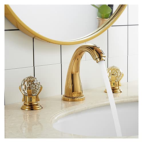 ゴールドの3穴広範囲ミキサー、ホット&コールド対応の真鍮製。AMDクリスタルデザインの浴室水栓。洗面台やキッチンにも最適。
