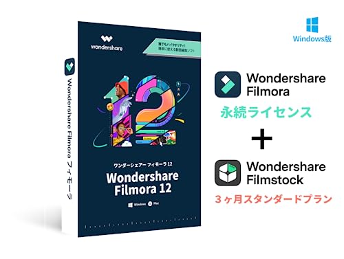 Wondershare Filmora 12 永続ライセンスとFilmstockの3ヶ月スタンダードプランがセットになった動画編集ソフトです。Windows版で、使いやすいビデオ編集機能を提供し、DVDパッケージ版でお届けします。