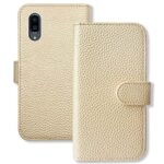 AQUOS sense3 plus対応の手帳型スマホケース。シボ型押しPUレザー製、シャンパン色のパール光沢で、シンプルでおしゃれなデザイン。カード収納付きのフリップカバーで、かわいくて使いやすいアイテム。