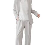 パンツスーツ レディース、洗えるワイドパンツとテーラードジャケットのセット。1つボタンデザインでストレッチ性あり。ビジネスやオフィス通勤に最適。カラーはライトグレー、サイズはMです。