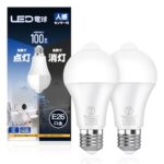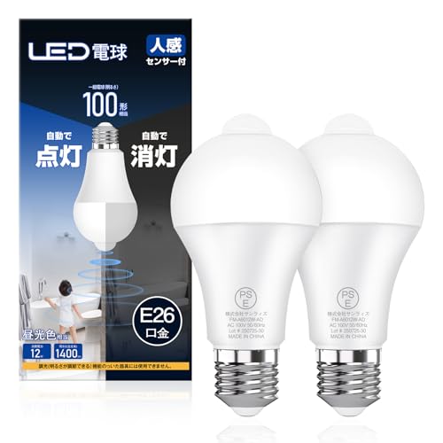 E26口金の人感センサーLED電球。100W形相当、昼光色6000K、12W、1400lm。自動点灯・消灯機能搭載。消し忘れ防止、階段や玄関に最適。調光不可、2個入。