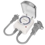 FUMITAKEの12時間タイマーは、防水カバー付きで屋外使用に最適。15A/125V対応、簡単操作で省エネ対策にも。自動点灯や消し忘れ防止機能付き。PSE認証済みで耐熱・耐寒性に優れた製品です。