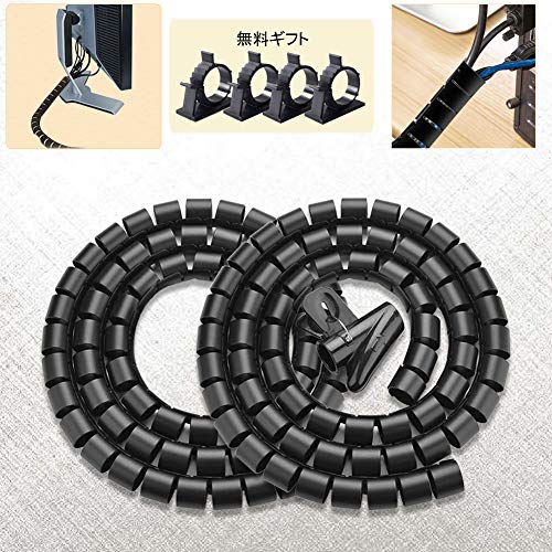ケーブルを整理できるスパイラルスリーブ。犬猫の噛み切り対策に最適な内径22mm、1.5mの2パック。繰り返し利用可能で、結束バンドと4枚のケーブルクリップ付き。家庭やオフィスで便利。