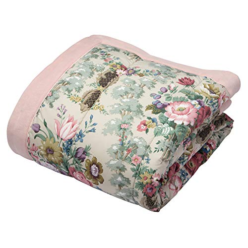 西川サンダーソンのキルトケット、140x190cm。洗えるローズシャトー柄で、やわらかなパイル地。首周りは縫い目なしで優しくフィットし、さらさらの吸水性。クラシックな花柄でウォッシャブル合繊肌掛け布団、ピンク色。