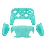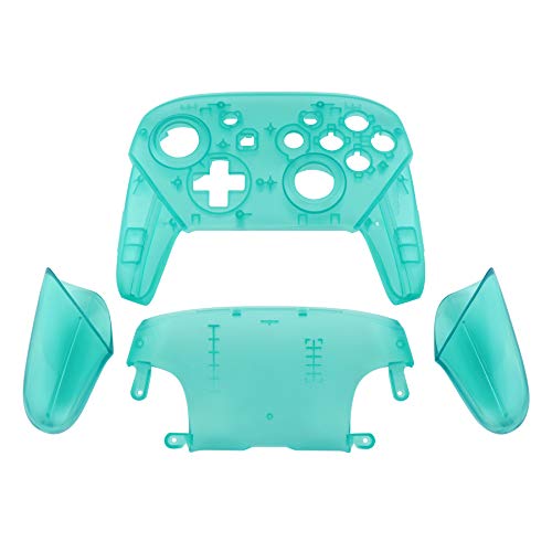 eXtremeRateのSwitch Proコントローラー用、エメラルドグリーンのクリア素材ハウジングケース。DIY交換に最適なフェースプレートとバックプレートハンドル付き。