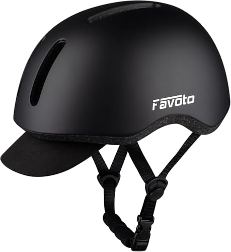 Favoto自転車ヘルメットは耐衝撃性に優れ、通気性も良好な超軽量設計。アゴパッド・バイザー付きで、サイズ調整可能(54cm-62cm)。脱着可能シールドあり。CE認証(EN1078)で安全性も充実。男女兼用、通勤や通学に最適なブラックモデル。