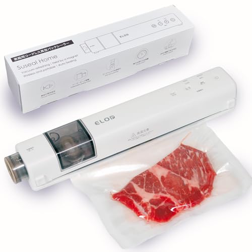 ELOD Suseal Home ホワイトは、充電式・コードレスの真空パック機。70kpaの吸引力で、自動吸引・シーリング・外部吸引の3モード搭載。真空保存が簡単で、浮かせる収納も可能。日本国内安心サービス付き。