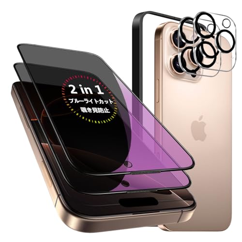 iPhone 16 Pro Max用の覗き見防止+ブルーライトカットガラスフィルム。全面保護、気泡ゼロ、指紋防止で貼り付け簡単。強化ガラスフィルム2枚とレンズ保護フィルム2枚入り。6.9インチ対応。