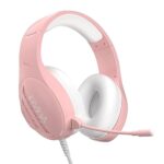 ステレオ 3.5mmジャックの有線ヘッドセット。ゲーム用で、マイク付き、ノイズキャンセリング機能を搭載。ボリュームコントロールあり。ノートPCやMacに対応、カラーはピンクです。