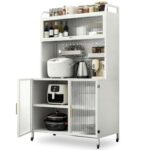 YASICAの食器棚は、一人暮らしに最適なスリムデザイン。5段収納で大容量、北欧風のスタイリッシュな外観。扉付きで防塵、キャスター付きで移動も簡単。サイズは80×39×153cm(ホワイト)。