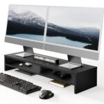 Fengeのモニター台は、幅80cmの2段木製デザインで、デスク周りの収納を効率化します。ブラックカラーで、パソコンやディスプレイを置くのに最適です。