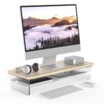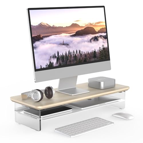 Fengeのモニタースタンドは、60cm幅の木製天板とアクリル製脚が特徴の2段構造です。デスクトップ用に最適で、パソコンやモニターの収納・整理整頓に役立ちます。