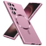 Galaxy S24 Ultra用の耐衝撃TPUケース。薄型で軽量、ストラップホール付き。指紋防止と耐久性に優れ、マグネティック対応の一体型レンズ保護設計。ピンクカラーで6.8インチモデルに適合。