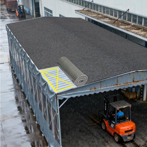 防音・遮音マットは厚さ15mmのPVC製で、衝撃吸収と防水効果があります。エアコン室外機の雨音を抑えるほか、鉄板屋根やサンルームの日よけ、玄関や廊下用カーペット(60x100cm)にも対応します。