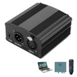 48Vファンタム電源アダプターは、コンデンサーマイクに電力を供給するための機器です。充電ケーブル付きで、XLR 3ピン接続対応。音楽録音機器に最適なプリアンプです。