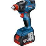 Bosch Professional 18Vコードレスインパクトドライバー GDX18V-200は、レンチ兼用で、充電器(GAL18V-40)、5.0Ahバッテリー2個、ベルトフック、キャリングケース付きです。