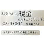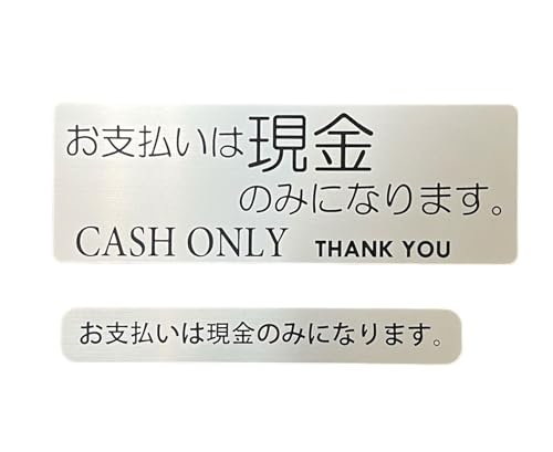 「お支払いは現金のみ」と明記したサインプレートです。シルバーヘアラインカラーで上品に仕上げられ、大サイズ150mmX52mm、小サイズ129mmX18mmのセット。店舗の現金払いを周知するのに最適です。