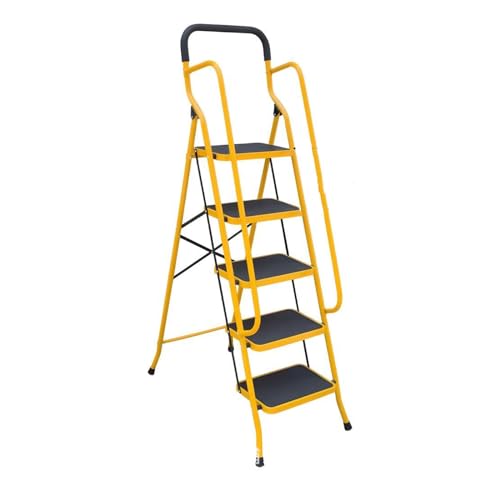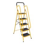 SIMCAT 5段折りたたみ脚立は、手すり付きで安全性が高く、安定した作業が可能です。軽量で持ち運びも便利。収納時はコンパクトになり、場所を取らない設計です。