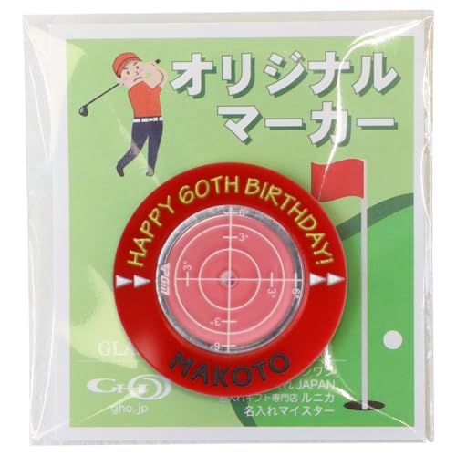 【名前入り】水平器付きゴルフマーカー(レッド)は、還暦祝いに最適です。メッセージ「HAPPY 60TH BIRTHDAY!」入りで、ゴルフデザインの台紙付き。傾斜が分かる水平器を搭載した名入れマーカーです。
