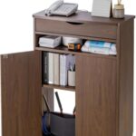 ルーター収納ボックスは、電話台としても使えるスリム設計。サイズは幅60×奥行27×高さ83cm。引き出し付きで、モデムや配線を隠してスッキリ収納。ダークブラウンの木目が落ち着いた雰囲気を演出します。