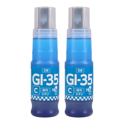 キヤノン用のGI-35シアン互換インクボトル2本セットです。顔料インクで大容量70mlは純正品の1.75倍。GX1030/GX2030に対応し、直接差し込んで使用可能。