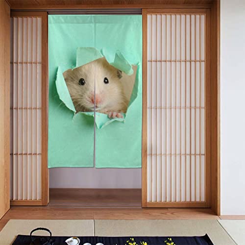 のれんハムスターデザインのアニメ風暖簾。おしゃれで緑色、洗える素材です。幅86cm、丈143cmで、キッチンやリビングの間仕切りに最適。目隠し・遮光効果があり、飲食店の出入り口にも。