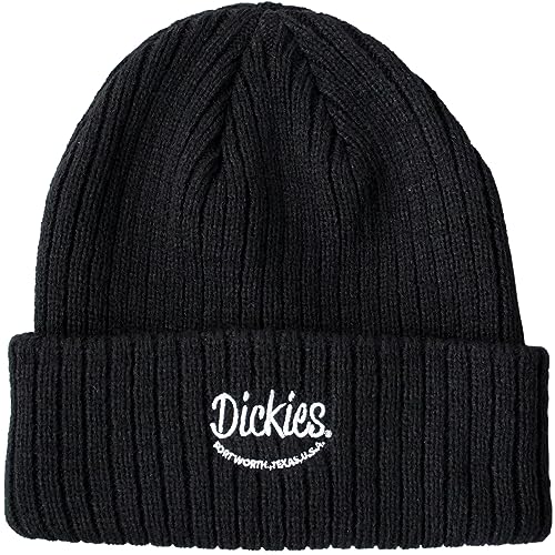 ディッキーズのルッキング刺繍リブ編みニットキャップ。メンズ・レディース兼用で、アクリル素材のビーニー。無地でシンプルなデザイン、ニードルブラックWHTカラー。実用的でスタイリッシュなアイテムです。