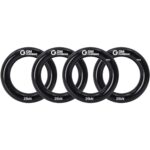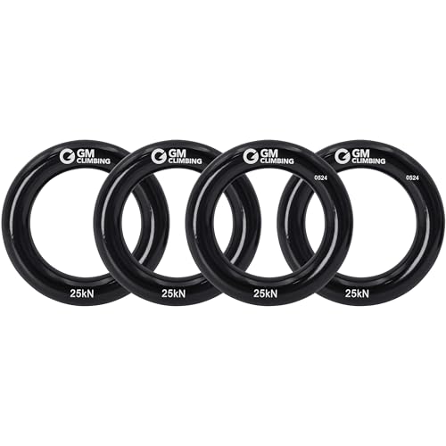 GM CLIMBINGの4個セットラッペルリングは、25kNの耐荷重を誇るアルミニウム製。クライミングやフリクションセーバーとして便利。Lサイズ、ブラックカラーで、ノットやヒッチリングにも対応。