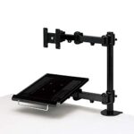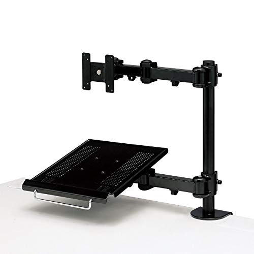 サンワサプライのアウトレットモニターアーム(CR-LA602)は、1画面用でデュアルに対応。ノートPC台付きで、クランプで固定可能。ポールは上下左右に回転し、高さ調節も可能。VESA規格に対応。箱にキズや汚れがあります。