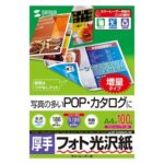 サンワサプライのアウトレットフォト光沢紙。カラーレーザー用で厚手、A4サイズの100シート入り。LBP-KAGNA4N-100。箱にキズや汚れがあるため、お得なアウトレット品です。
