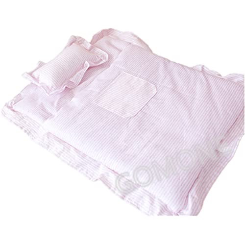 ピンク縞の人形用キルトおふとんセット。6-8インチのドール用マットレス、ベッドシーツ、まくらが含まれ、おままごとやお世話遊びに最適。幼児の女の子へのインタラクティブな教育ギフトにおすすめ!