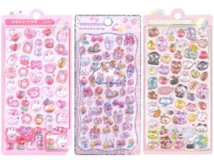 立体シールはステンドグラス風で、透明なデコレーションステッカーです。うるつやシールとして3Dエンボス加工が施され、猫やうさぎ、食べ物のデザインがあります。簡単に貼れて、携帯や手帳に最適な全6枚セットです。